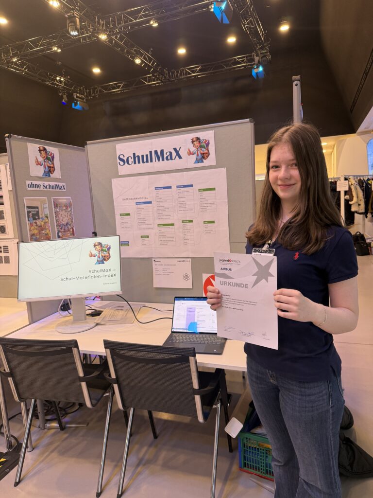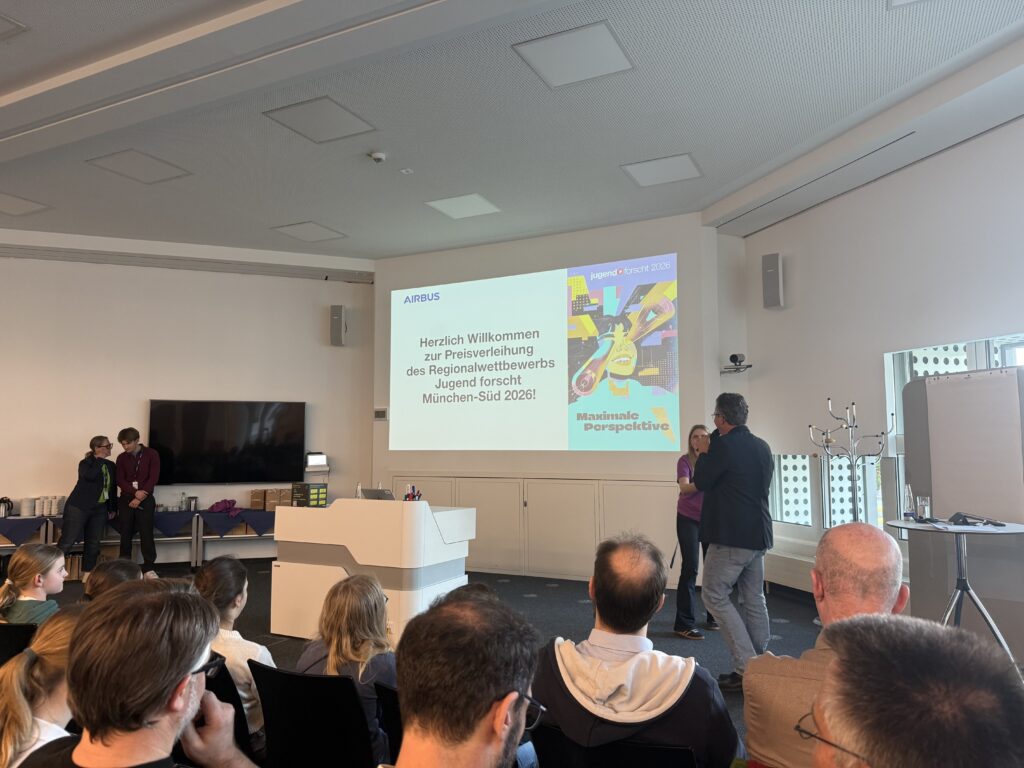 Am 4. März 2026 habe ich bei dem Regionalwettbewerb „Jugend forscht Junior“ teilgenommen. Der Wettbewerb wurde von Airbus Defence and Space in Ottobrunn ausgerichtet. Nachdem ich dort meinen Stand aufgebaut hatte, fand auch gleich mein Jury-Gespräch statt. Danach habe ich an einer interessanten Führung auf dem Airbus-Gelände teilgenommen. Ich hatte den ganzen Tag über sehr viel Spaß, vor allem da die anderen Teilnehmer, die Jury und die Mitarbeiter von Airbus sehr nett waren und die Atmosphäre sehr gut war. Da ich einen 1. Preis gewonnen habe, habe ich mich für den Landeswettbewerb qualifiziert und freue mich schon sehr darauf.