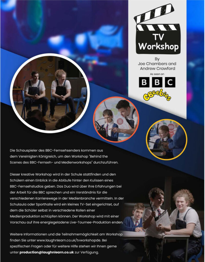 Am vergangenen Montag, 10. November 2025, war „Laugh n Learn“ bei uns zu Besuch mit einem Behind the Scenes TV Workshop, konzipiert vom Schauspieler und Produzenten Joe Chambers, bekannt aus BBC-Produktionen. Die zwei jungen Schauspieler:innen aus Großbritannien bzw. Irland, die die Workshops für die Jahrgangsstufen 8 bis 11 – natürlich auf Englisch – leiteten, waren mit ganz viel persönlichen Hintergrundwissen und Schwung dabei, die Schüler:innen haben sich hervorragend engagiert (und laut der Workshopleiter beeindruckende Englischkenntnisse gezeigt) und die Produktion einer kleinen witzigen Szene wurde dem Motto der Veranstaltung voll gerecht: they laughed and learned 😊.